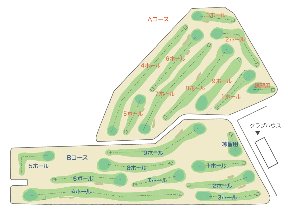 Aコース・Bコースともに9ホールで構成されており、初心者から経験者まで楽しめる距離とパー設定となっています。